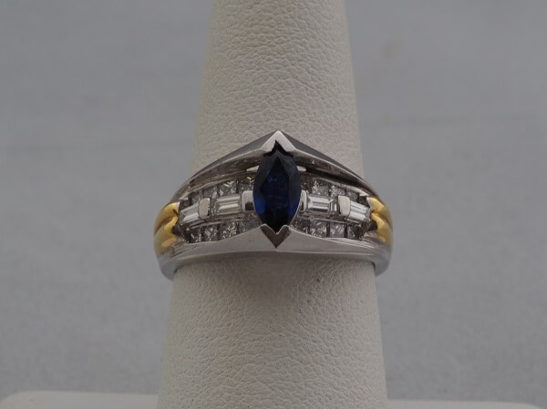 Faber Metalli / Platinum and 18k Yellow Gold, Marquise Sapphire and Diamond Ring – $2,600
